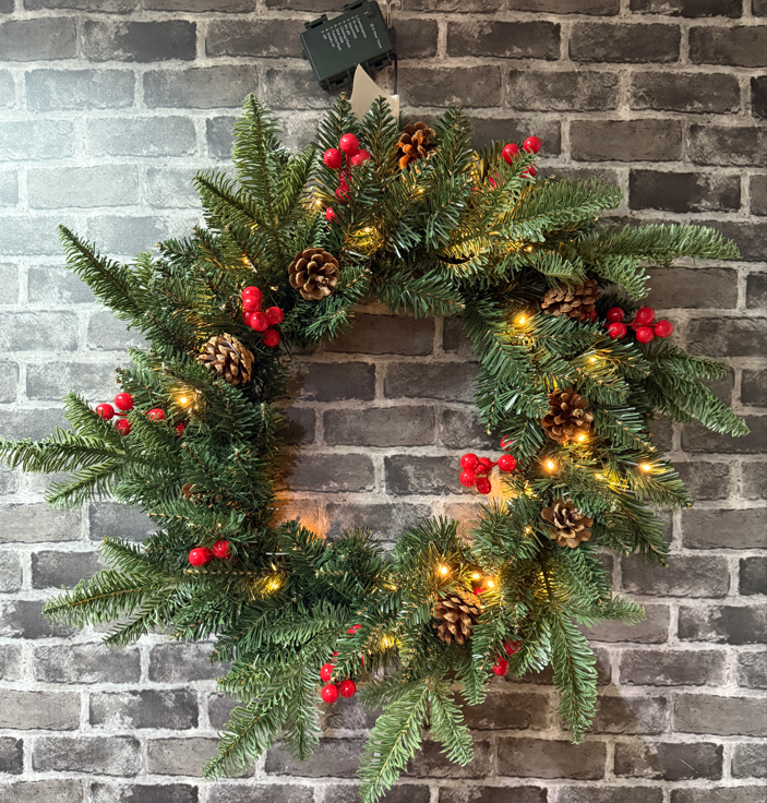 Χριστουγεννιάτικο, φωτιζόμενο στεφάνι LED 40L θερμό Φ50εκ με στολίδια μπαταρίας. Αποτελείται από 100 κλαδιά. Περιλαμβάνει 40 θερμά λευκά LED , κουκουνάρια και κόκκινους καρπούς.