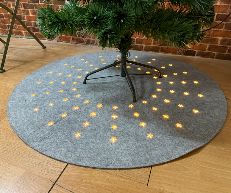 Διακοσμητικό τσόχινο χαλάκι δέντρου Φ90εκ γκρι με λαμπάκια 20 LED θερμό με τροφοδοτικό. Το πάχος της τσόχας είναι 4mm.